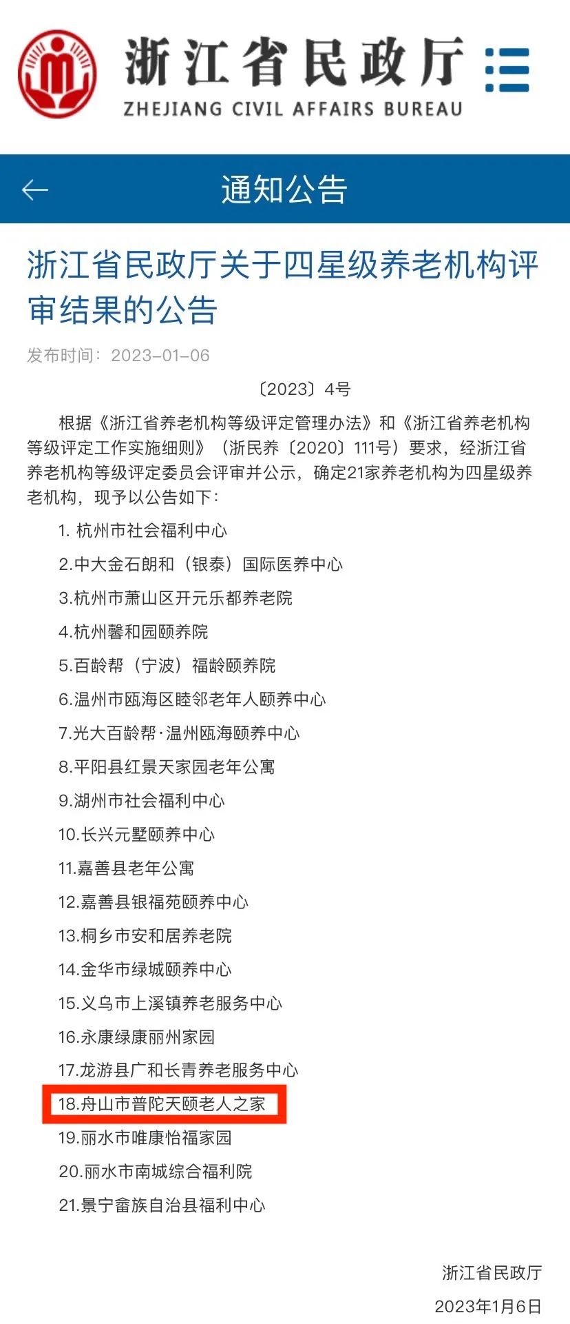 1月6日,浙江省民政廳發(fā)布《浙江省民政廳關(guān)于四星級養(yǎng)老機(jī)構(gòu)評審結(jié)果的公告》,康久集團(tuán)旗下舟山市普陀天頤老人之家獲評浙江省四星級養(yǎng)老機(jī)構(gòu)。