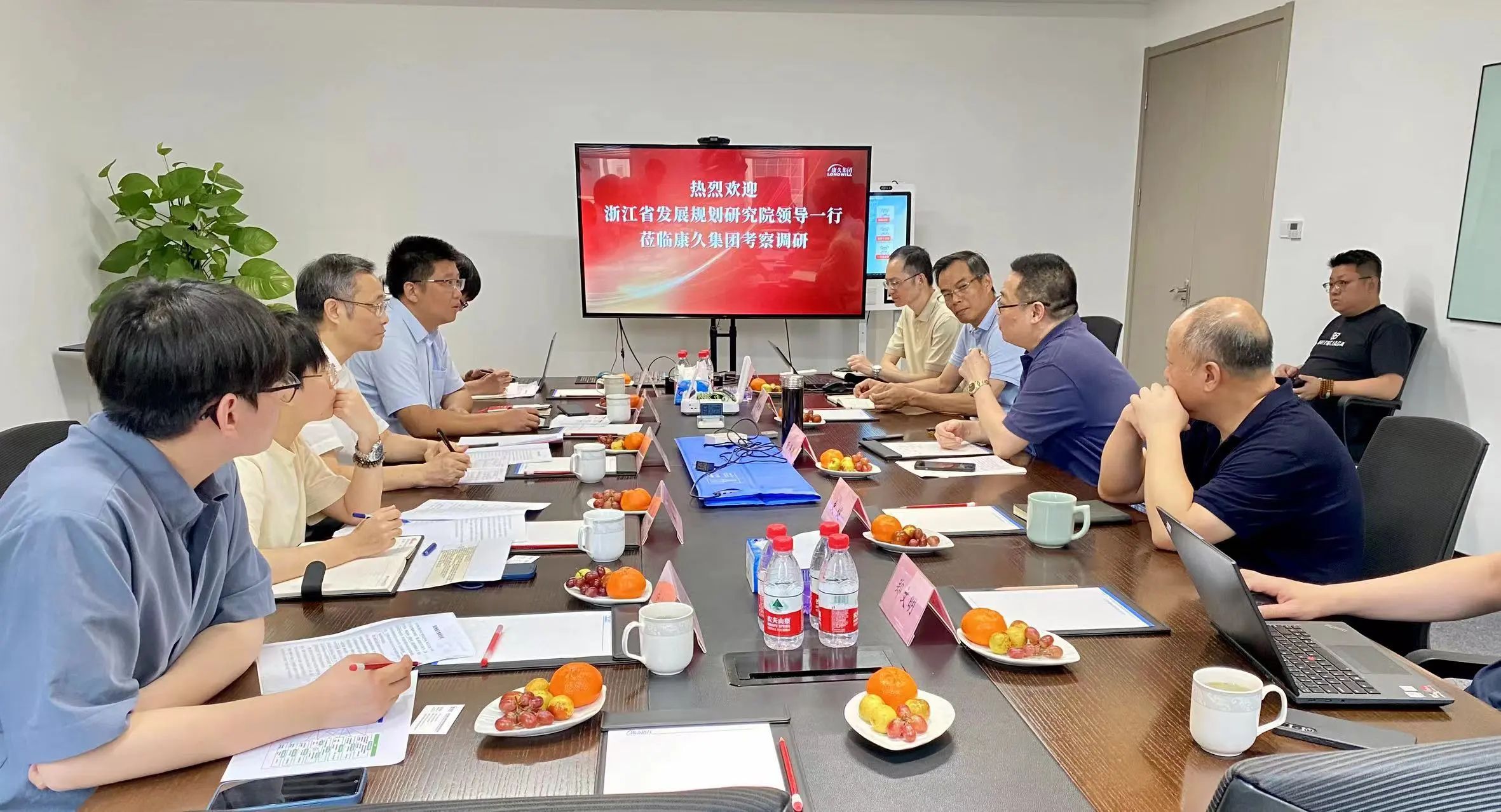 7月28日,浙江省發(fā)展規(guī)劃研究院原副院長、高級經(jīng)濟師董嘉明,浙江省發(fā)展規(guī)劃研究院社會所副所長、高級工程師劉堂福等領(lǐng)導一行蒞臨康久集團考察調(diào)研??稻眉瘓F董事長耿海波、高級副總裁史健、副總裁朱惠民等領(lǐng)導陪同調(diào)研。